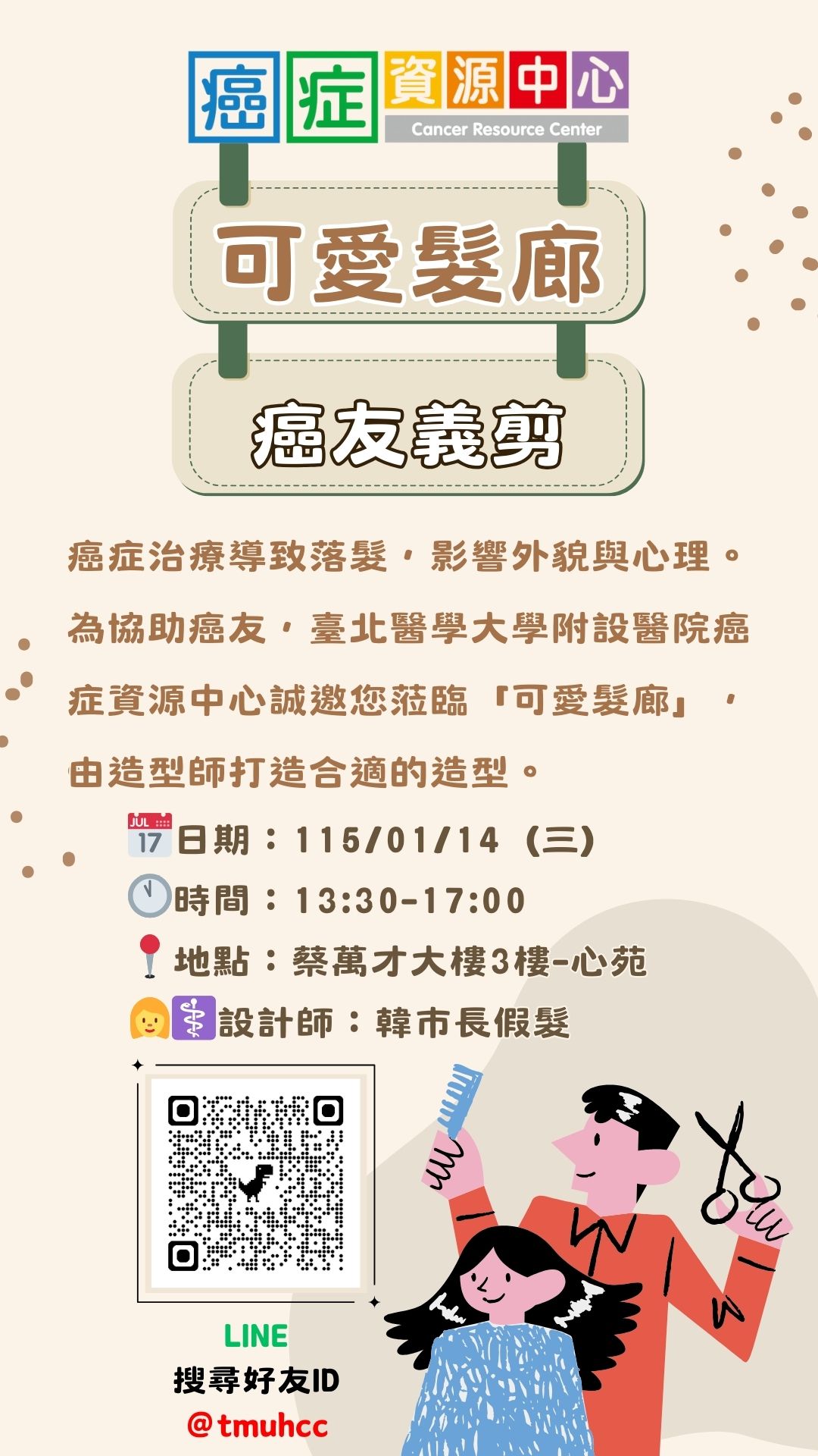親愛的朋友:在治療過程中,落髮常讓人感到焦慮與不安,不僅影響外貌,也帶來心理與社交壓力。臺北醫學大學附設醫院癌症資源中心誠摯邀請您蒞臨溫馨的「可愛髮廊」,由專業美髮設計師,協助您打造最合適的造型(多為治療所需的剃髮或極短髮),陪您勇敢面對改變。