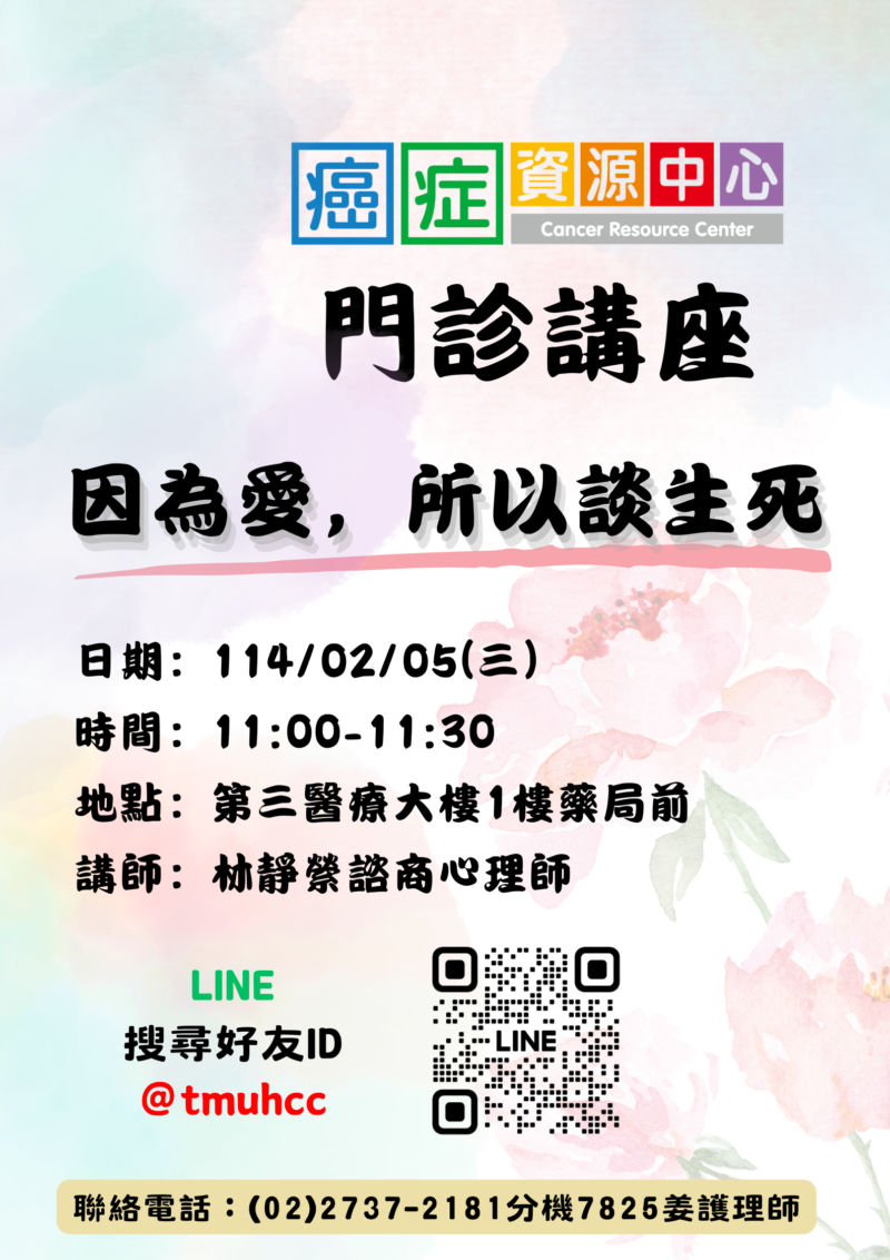 【臺北醫學大學附設醫院】114/2/5(三)11:00-11:30癌症資源中心門診講座:因爲愛,所以談生死