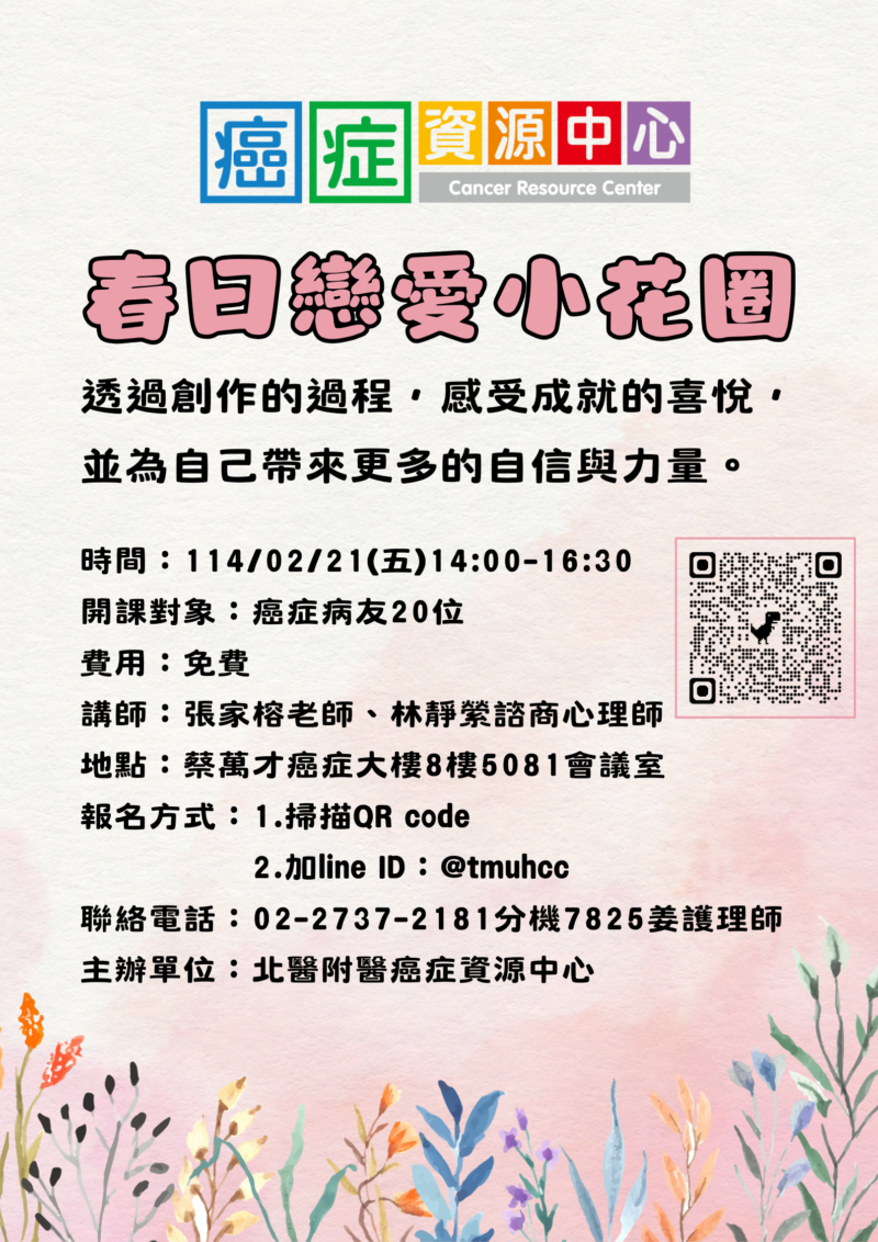 鄭雅瑋2025-01-27T09:44:56+00:00臺北醫學大學附設醫院癌症資源中心病友活動 這是一個專屬於你/你的療癒時光,不僅可以放鬆心情,還能在輕鬆愉快的氛圍中, 與其他病友分享彼此的故事,促進彼此的交流與支持。 透過創作的過程,感受成就的喜悅,並為自己帶來更多的自信與力量。 主題:春日戀愛小花圈 時間:114/02/21(五)14:00-16:30 **13:50-14:00簽到入座 地點:蔡萬才癌症大樓8樓5081會議室 地址:110台北市信義區吳興街260巷-第五大樓蔡萬才癌症大樓 [...]