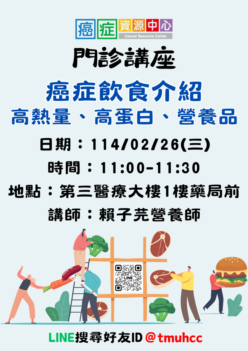 【臺北醫學大學附設醫院】門診講座114/02/26(三)10:30-11:30癌症飲食-高熱量高蛋白與營養品的介紹