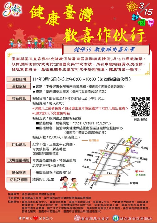 鄭雅瑋2025-02-11T09:03:57+00:00中央健康保險署(下稱健保署)迎接健保邁入30週年, 健保署南區業務組與臺南開基玉皇宮於3月15日(星期六)共同舉辦 「健康臺灣 歡喜作伙行」踩街活動,熱情邀請民眾召親朋好友一起踩街走訪府城,賞古蹟、看表演,精彩連連。活動報名可採線上報名網址:https://reurl.cc/EgWYEv,南區業務組聯合服務中心亦代接受報名,費用每人200元,80歲以上長者報名免費。該活動備有精美紀念衫,走完全程者即可獲得一份玉皇宮平安壽麵、奇美銀絲卷及新式毛豆等實用禮品。 當天活動起點從健保署南區業務組出發,沿途經全臺吳姓大宗祠、赤崁樓、祀典大天后宮、臺南祀典武廟、祀典武廟春秋樓、全美戲院、司法博物館、臺南市美術館2館、武德殿、國立臺灣文學館、臺南市美術館1館、農田水利署嘉南管理處、臺南孔子廟、葉石濤文學紀念館、吳園藝文中心、大觀音亭、祀典興濟宮,最後抵達臺南開基玉皇宮,路線總長3.6公里,走訪臺南市25個國定及市定古蹟等景點,感受台南古都獨特文化。此外,在中繼站「臺南祀典武廟」、「臺南美術館2館」、「吳園藝文中心」安排精彩表演,並於踩街路線,準備滿滿的驚喜彩蛋等著與民眾分享,歡迎全國民眾共襄盛舉一起踩街、遊府城。 活動訊息轉載自衛生福利部官網首頁/最新消息/焦點新聞/114年衛生福利部新聞/2月新聞:https://www.mohw.gov.tw/cp-7181-81460-1.html