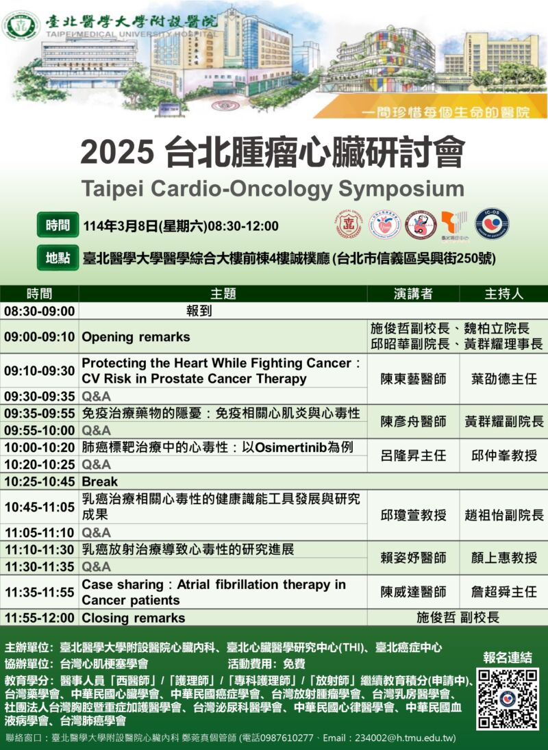 鄭雅瑋2025-02-07T10:31:49+00:00時間:114年3月8日(星期六)09:00-12:00 地點:本校醫學綜合大樓前棟四樓誠樸廳 費用:免費 積分:「西醫師」/「護理師」/「專科護理師」/「放射師」繼續教育積分(申請中)、台灣藥學會、中華民國心臟學會、中華民國癌症學會、台灣放射腫瘤學會、台灣乳房醫學會、社團法人台灣胸腔暨重症加護醫學會、台灣泌尿科醫學會、中華民國心律醫學會、中華民國血液病學會、台灣肺癌學會(申請中),全程參加並依衛生福利部規定簽到與簽退且親寫積分申請相關資料者,會有前述醫事職類人員之上課積分。 報名方式:預先報名,限額100人,額滿為止。敬請於114年3月3日(星期一)中午前連結https://docs.google.com/forms/d/1t0svScf7t6CnK0SUw-byIxjIid0e-SHbsR67OBqn6wo/viewform?edit_requested=true#settings並將報名表資料填妥完整提交送出。(如附件) 活動聯絡窗口:臺北醫學大學附設醫院心臟內科鄭菀真個管師(電話0987-61-0277簡碼0277、Email:234002@h.tmu.edu.tw)