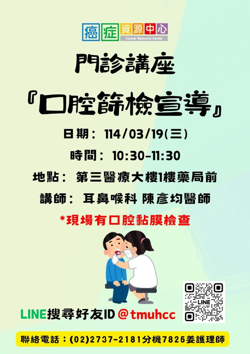 主題:口腔篩檢宣導 日期:114/03/19(三)10:30-11:30 地點:臺北醫學大學附設醫院第三醫療大樓1樓藥局前 人數及對象:對本次主題有興趣之民眾 講師:耳鼻喉科陳彥均醫師 主辦單位:北醫附醫癌症資源中心 臺北醫學大學附設醫院癌症資源中心 https://www.youtube.com/@user-cf6ro1py9g LINE搜尋好友ID:@tmuhcc / lin.ee/QsePc5c