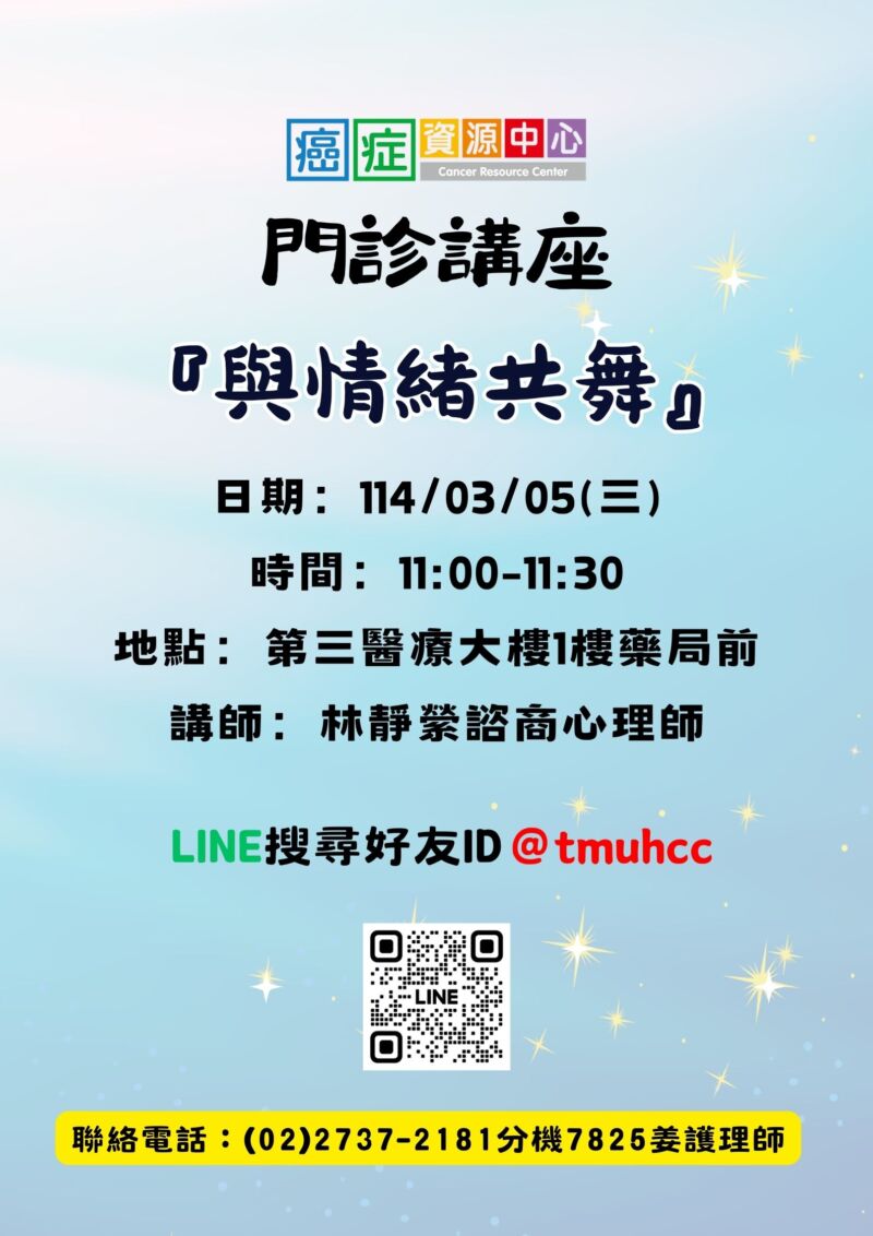 【臺北醫學大學附設醫院】114/03/05(三)11:00-11:30癌症資源中心門診講座:與情緒共舞