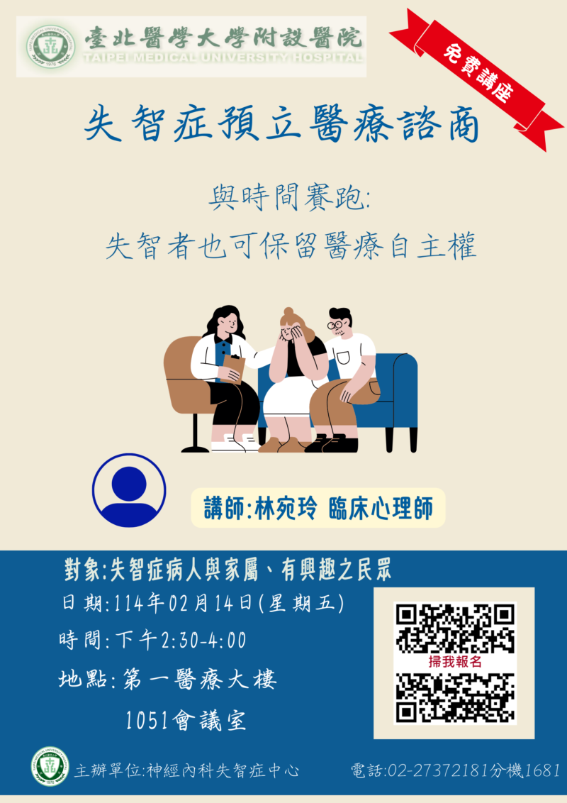【臺北醫學大學附設醫院】2/14(五)14:30-16:00 失智症預立醫療諮商講座 歡迎參加