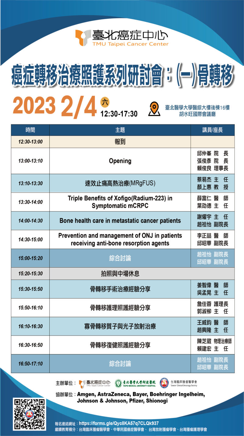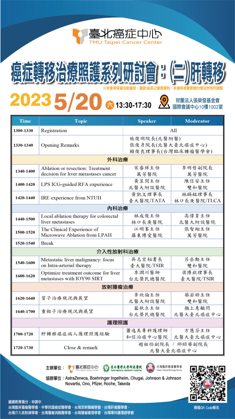 Nancy2023-05-02T13:40:09+00:00由臺北癌症中心、臺北醫學大學附設醫院與臺灣臨床腫瘤醫學會合作主辦「癌症轉移治療照護」系列研討會的第二場,將於2023年05月20日下午舉行,敬邀各位先進長官蒞臨參與。 主辦單位:臺北癌症中心、臺北醫學大學附設醫院、台灣臨床腫瘤學會 協辦單位:AstraZeneca、Boehringer Ingelheim、Chugai、Johnson & Johnson、Novartis、Ono、Pfizer、Roche、Takeda 課程日期:112年05月20日(六) 13:30-17:30 實體主場:財團法人張榮發基金會國際會議中心10樓1002室(地址:台北市中正區中山南路11號) 活動報名:https://forms.gle/hZsmE6fGcvJibcwV9 [...]