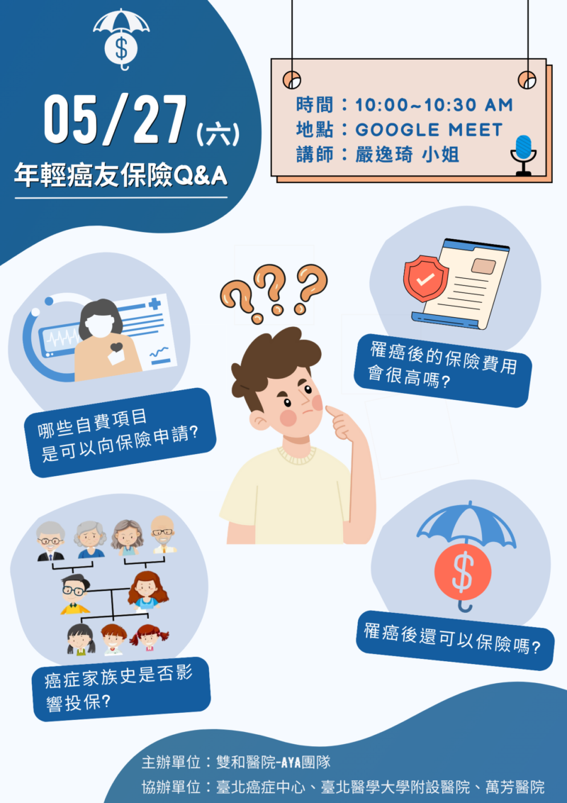 Nancy2023-05-18T10:49:57+00:00時間:2023.05.27(六)上午 10:00-10:30 主題:年輕癌友保險Q&A 手刀報名表: https://reurl.cc/DmWL5e 使用手機/平板/電腦點擊以下連結即可上線活動: https://meet.google.com/eus-xuju-hjc?authuser=1&pli=1 本活動採取線上視訊的方式,活動時間為30分鐘,歡迎您參與線上分享。