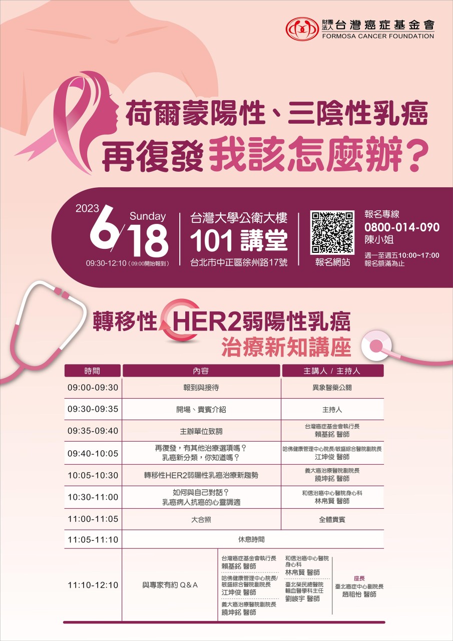 Nancy2023-06-13T14:24:13+00:00荷爾蒙陽性、三陰性乳癌再復發,我該怎麼辦? 轉移性HER2弱陽性乳癌治療新知講座 面對轉移性乳癌,你有更好的治療新選擇! 日期:112年06月18日(日) 時間:上午09:30-12:10 (09:00報到) 地點:台灣大學公衛大樓 101講堂 ( 台北市中正區徐州路17號 ) 參加人數:200位 (由於名額有限,僅限乳癌病友及親屬參與,敬請事先報名) 主辦單位:財團法人台灣癌症基金會 [...]