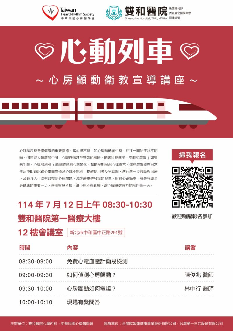 心跳是反映身體健康的重要指標,當心律不整,如心房顫動發生時,往往一開始症狀不明顯,卻可能大幅增加中風、心臟衰竭甚至猝死的風險。隨著科技進步,穿戴式裝置(如智慧手錶、心律監測器)能隨時監測心跳變化,幫助早期發現心律異常。這些裝置能在日常生活中即時記錄心電圖或偵測心跳不規則,提醒使用者及早就醫,進行下一步診斷與治療。及時介入可以有效控制心律問題,減少嚴重併發症的發生。照顧心跳節奏,就是守護全身健康的重要一步,善用智慧科技,讓小鹿不再亂撞,讓心臟穩健有力地陪伴每一天。 活動資訊如下: ●活動日期:113年07月12日(六) ●活動時間:08:30 - 10:30 ●活動地點:雙和醫院第一醫療大樓12樓會議室 ●報名連結:https://reurl.cc/qGQqYy ◎現場提供免費心電血壓計檢測,歡迎踴躍報名參加! [...]