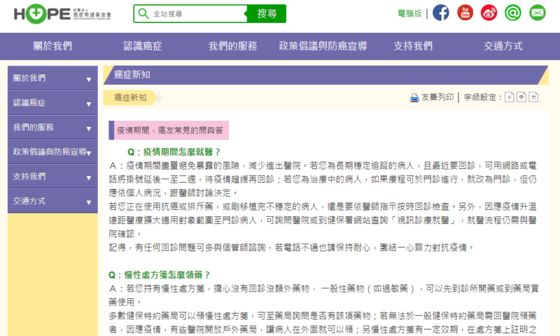 vica2021-05-25T10:40:01+00:00疫情期間,癌友常見的問與答。 Q:疫情期間怎麼就醫? A:疫情期間盡量避免暴露的風險,減少進出醫院。若您為長期穩定追蹤的病人,且最近要回診,可用網路或電話將掛號延後一至二週,待疫情趨緩再回診;若您為治療中的病人,如果療程可於門診進行,就改為門診,但仍應依個人病況,跟醫師討論決定。 若您正在使用抗癌或排斥藥,或剛移植完不穩定的病人,還是要依醫師指示按時回診檢查。另外,因應疫情升溫遠距醫療擴大適用對象範圍至門診病人,可詢問醫院或到健保署網站查詢「視訊診療就醫」,就醫流程仍需與醫院確認。 記得,有任何回診問題可多與個管師諮詢,若電話不通也請保持耐心,團結一心齊力對抗疫情。 [...]