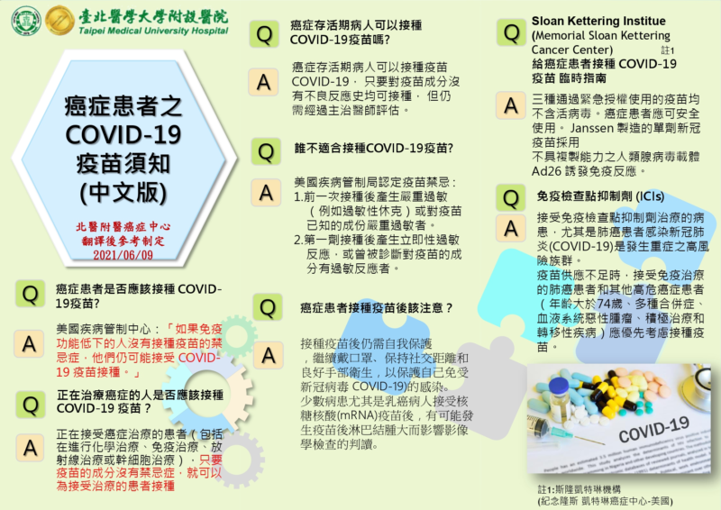 vica2021-06-03T14:59:33+00:00新冠肺炎疫情進入社區傳播階段,疫苗接種成為全民關注議題,近兩週癌症門診最熱門問題就是癌症病人是否可接種COVID-19疫苗。臺北醫學大學台北癌症中心院長暨附設醫院癌症副院長李冠德表示,綜合現有醫學證據,癌症病人均應優先接種疫苗,其家庭接觸者亦然,但每位癌症病人接種的時間點會因罹患癌別、接受療程有所不同,建議可與醫師討論,於適合時機完成疫苗接種,確實保護自己。【下圖:臺北癌症中心李冠德院長】 李冠德院長指出,近來門診遇到不少癌症病人及家屬詢問接種COVID-19疫苗的相關問題,由病人及家屬的問題可以發現,坊間現有資訊眾說紛紜,因此,他整理常見的6類問題,根據近期美國頂尖血液病和腫瘤科專家組成的委員會提供之接種建議以及現有醫學證據,彙整為以下Q&A。 [...]