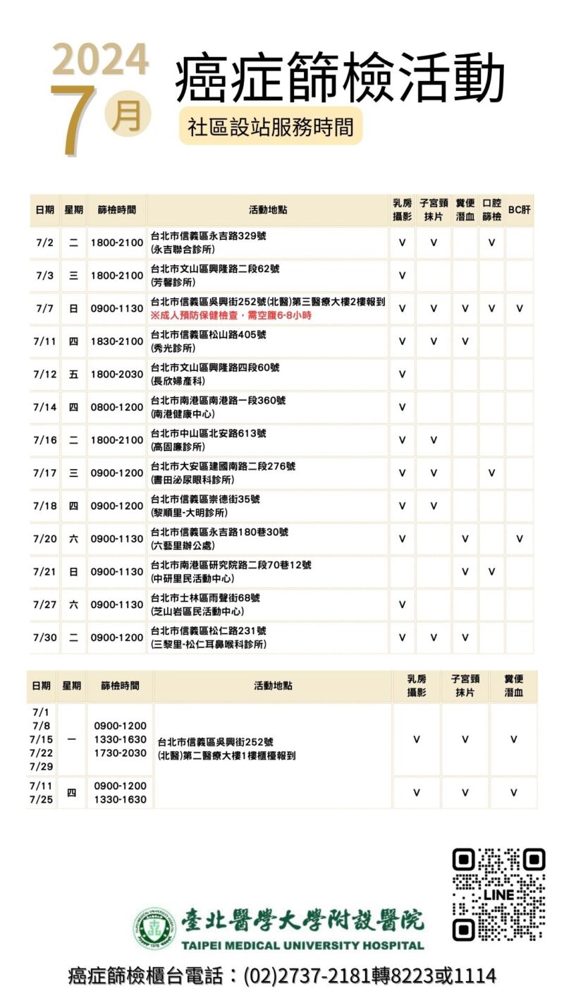 臺北醫學大學附設醫院-113年7月癌症篩檢活動