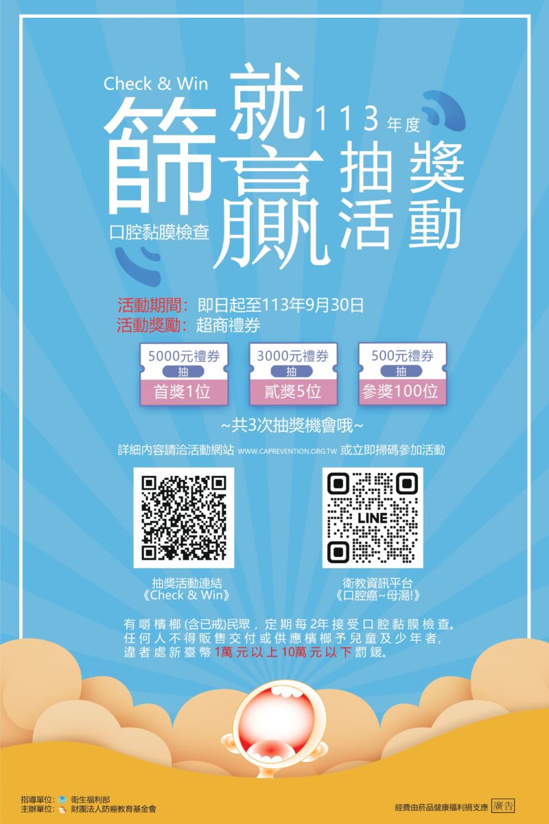 鄭雅瑋2024-07-11T09:09:46+00:00報名資格:有吸菸或嚼檳榔之行為,完成或有意願接受衛生福利部預防保健服務之每兩年一次口腔黏膜檢查者。(外籍人士不適用)。 活動期間:即日起至113年9月30日止 活動獎勵:超商禮券(凡有吸菸或嚼檳榔之行為,完成或有意願接受本部預防保健服務口篩者,掃描活動海報QR code線上填寫基本資料及完成「檳榔危害暨健康宣導意見調查問卷」後即可參加抽獎,活動將於6月、8月及10月抽出幸運得主,每次抽獎獎勵為超商禮券:5,000元1位、3,000元5位、500元100位) 資料來源:衛生福利部口腔健康司活動訊息 https://dep.mohw.gov.tw/DOOH/cp-6508-78413-124.html