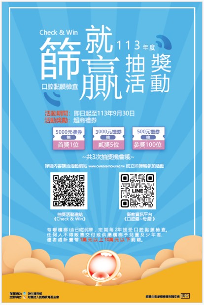鄭雅瑋2024-05-30T14:11:46+00:00衛生福利部委託財團法人防癌教育基金會辦理之『Check & Win活動』 一、活動期間:即日起至113年9月30日。 二、報名資格:有吸菸或嚼檳榔之行為,完成或有意願接受衛生福利部預防保健服務之每兩年一次口腔黏膜檢查者。 三、報名方式:符合條件即可掃描填寫問卷,經主辦單位確認完整填寫,同意相關規範無誤後,獲得抽獎資格。 四、獎勵條件:113年6月、8月及10月各進行抽獎1次。 五、法律顧問:財團法人防癌教育基金會法律顧問。 六、活動獎勵:每次抽獎獎勵超商禮券(5,000元1位、3,000元5位、500元100位),共3次。 七、管轄法院:倘若此抽獎活動有爭議或糾紛,以中華民國法令為準據法,並以台灣台北士林地方法院為第一審管轄法院。 [...]