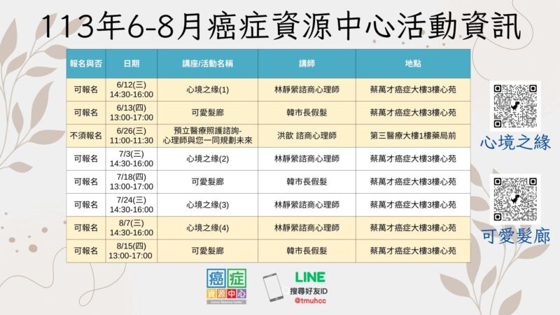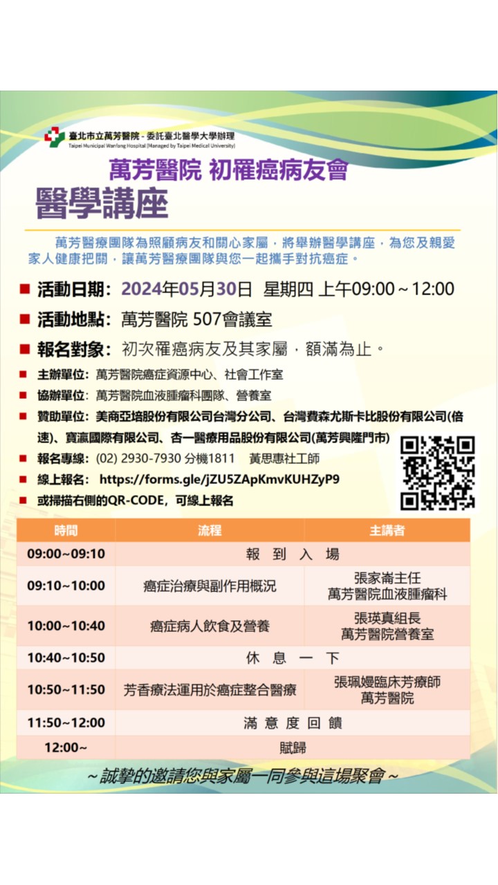 鄭雅瑋2024-05-23T09:39:43+00:00(一)活動時間:113.05.30(四)09:00~12:00 (二)活動地點:萬芳醫院五樓507會議室 (三)活動對象:以初診斷罹患癌症病友或其家屬優先,額滿為止。 【註: 108年(含)以後確診為癌症者,不限本院癌症病友或家屬】 (四)報名連結網址:https://forms.gle/jZU5ZApKmvKUHZyP9