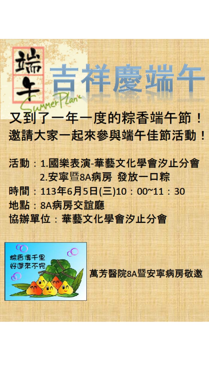 鄭雅瑋2024-05-23T09:40:43+00:00(一)活動時間:113.06.05(三)10:00~11:30 (二)活動地點:8A病房交誼廳 (三)活動對象:以本院8A血腫科病房及安寧病房之病友及其家屬為主 (四)活動內容:國樂表演、發放一口粽